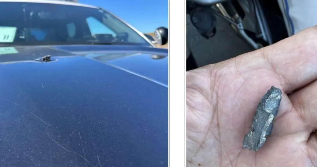 One of the officers said it sounded like pebbles were raining down on his patrol motorcycle. Several pieces of shrapnel were found, including one that dented the hood of a patrol car.