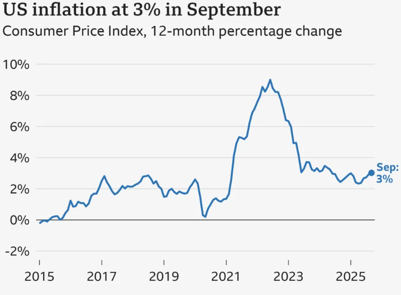 Economic data from September shows the US inflation rate hit 3% for the first time since January, while consumer confidence fell to its lowest level since April due to concerns over the cost of living, jobs and the wider economy.